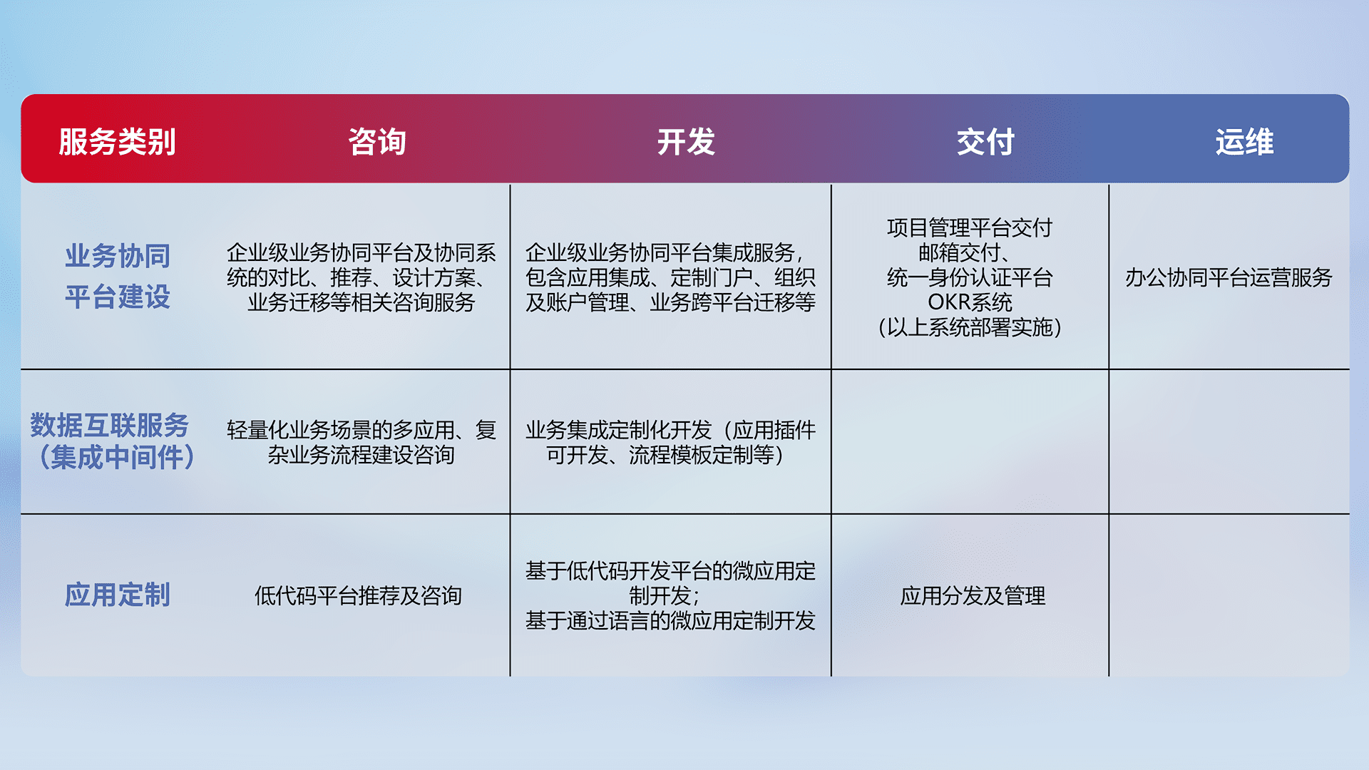 针对钉钉、、、企微、、IDaas等平台级产品提供产品的规划、、方案、、交付、、、定制化开发等服务,,,,实现如统一协同办公、、、智能客户服务、、混合会议管理、、智能数据查询、、、、等业务场景,,,,实现数字化转型。。。